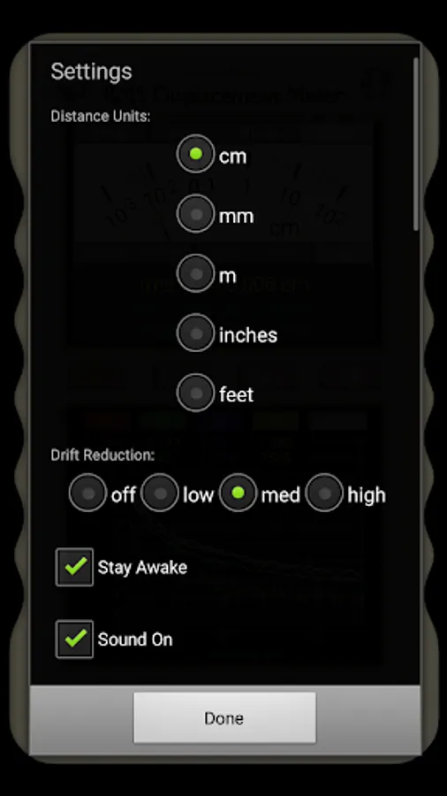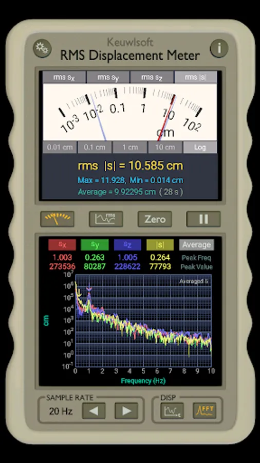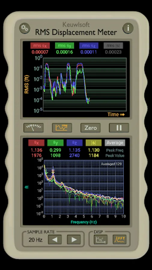 Any drift or error in the accelerometer and/or other sensor readings is quickly magnified in the double integral, such that even a stationary device will quickly show displacement readings going wild. Therefore this App is for measuring alternating displacements. i.e we apply a drift reduction algorithm to remove any DC component and then measure the AC displacement by means of a Root Mean Square (RMS) value, or perform a Fast Fourier Transform (FFT) to obtain the frequency spectrum.