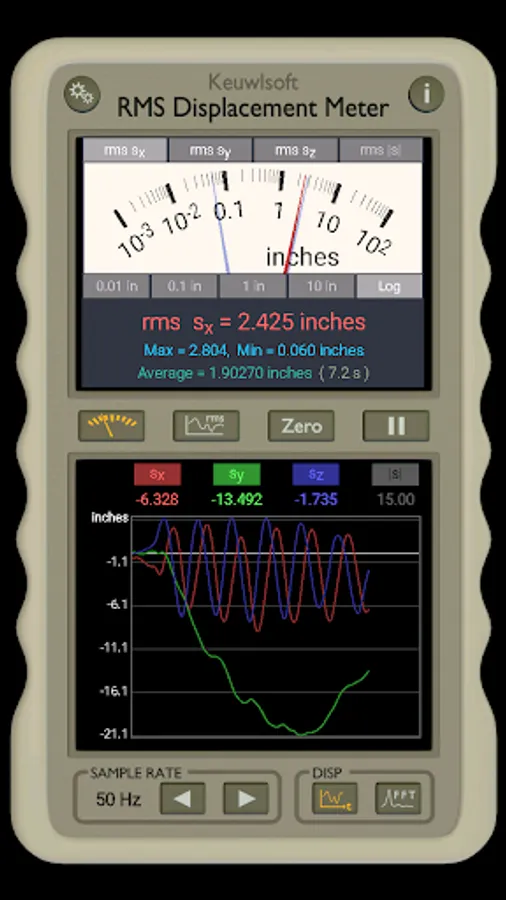 • Gauge to show the RMS displacement in the X,Y or Z directions, or its magnitude.