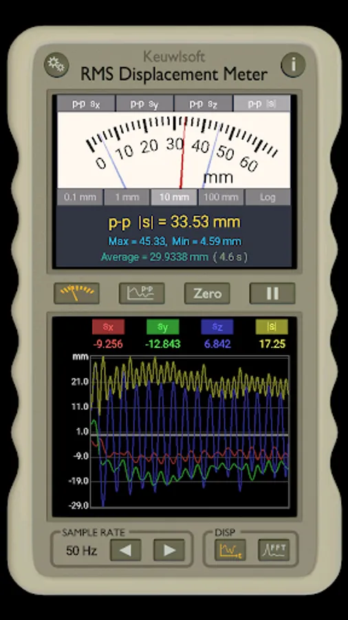 An example: Move the device in a circle along two of its axis. You should see two sinusoidal traces 90 degrees out of phase in the time series graph, determine the rotation frequency in the frequency spectrum and obtain an estimate of the diameter of the circle from the gauge or its corresponding graph (when set to peak to peak mode in settings).