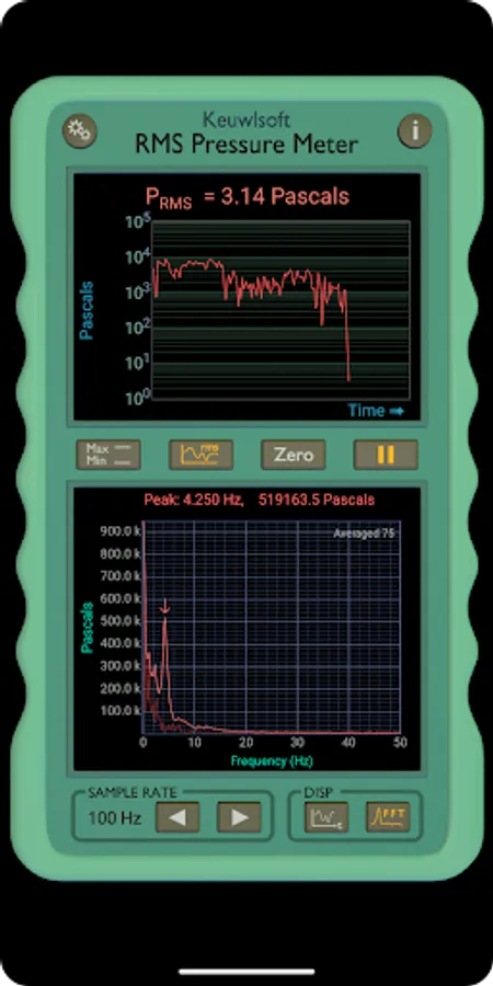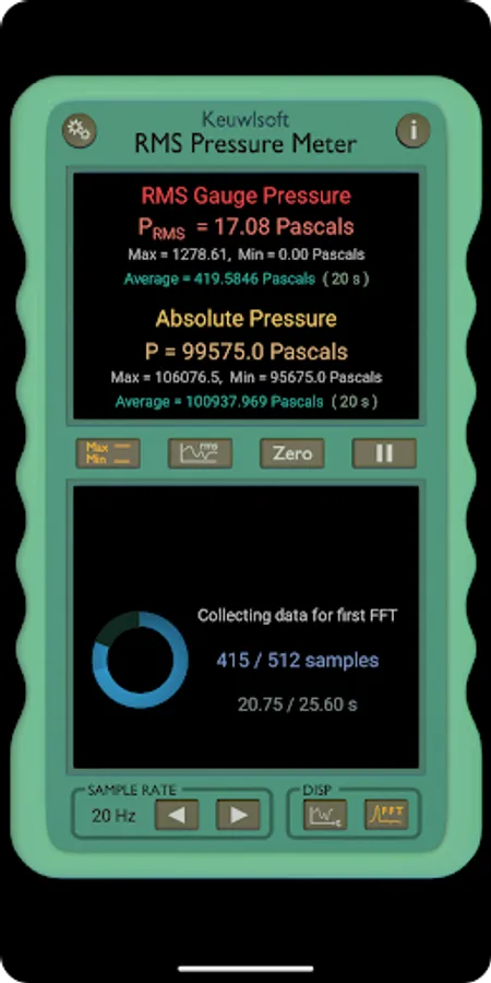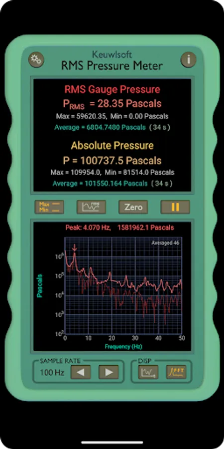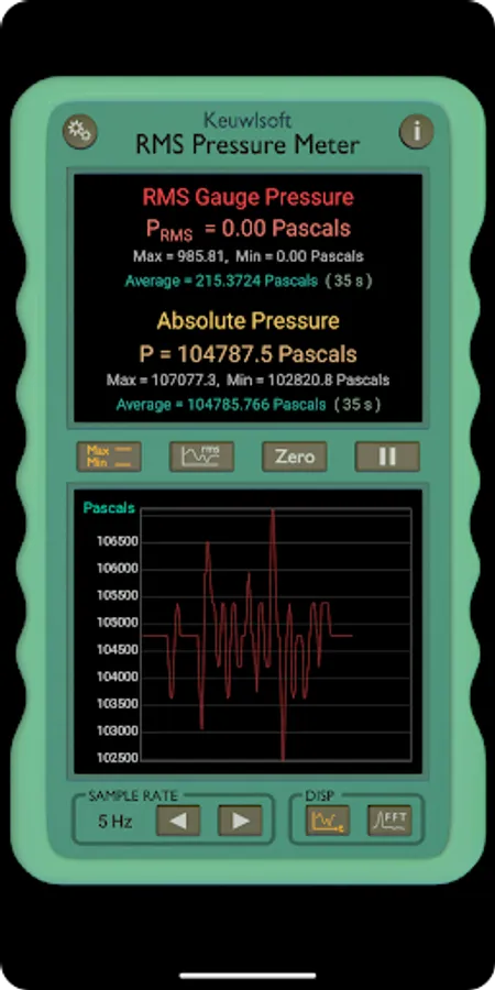 • The upper displays shows Max, Min and average values, or a graph of the RMS gauge pressure readings over time.