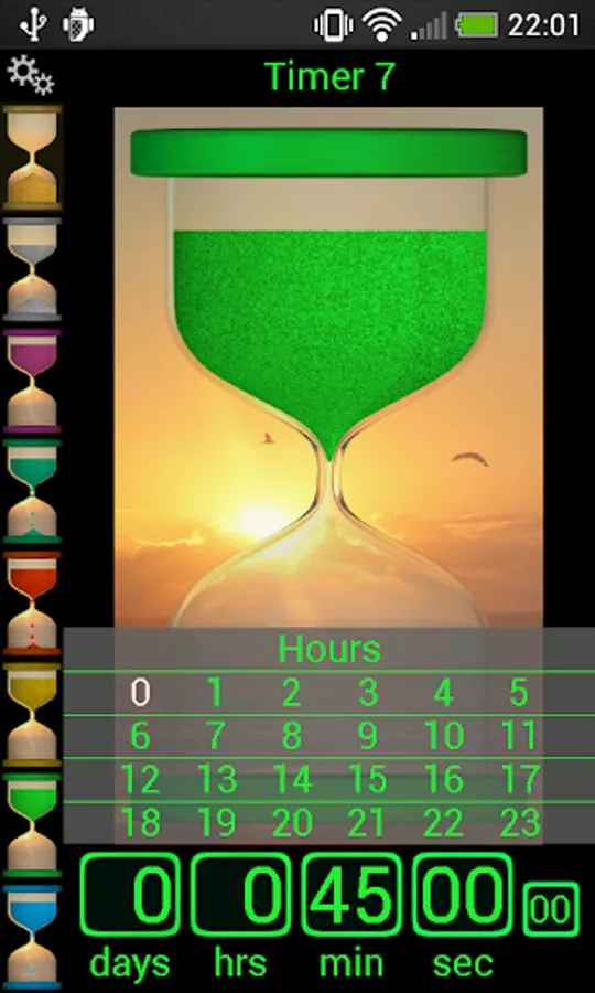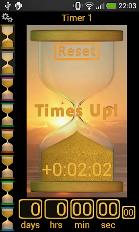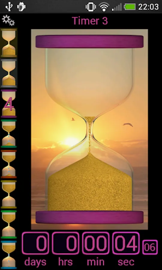 Operate up to 8 sand timers simultaneously (each one is colored differently and selected at left of screen).