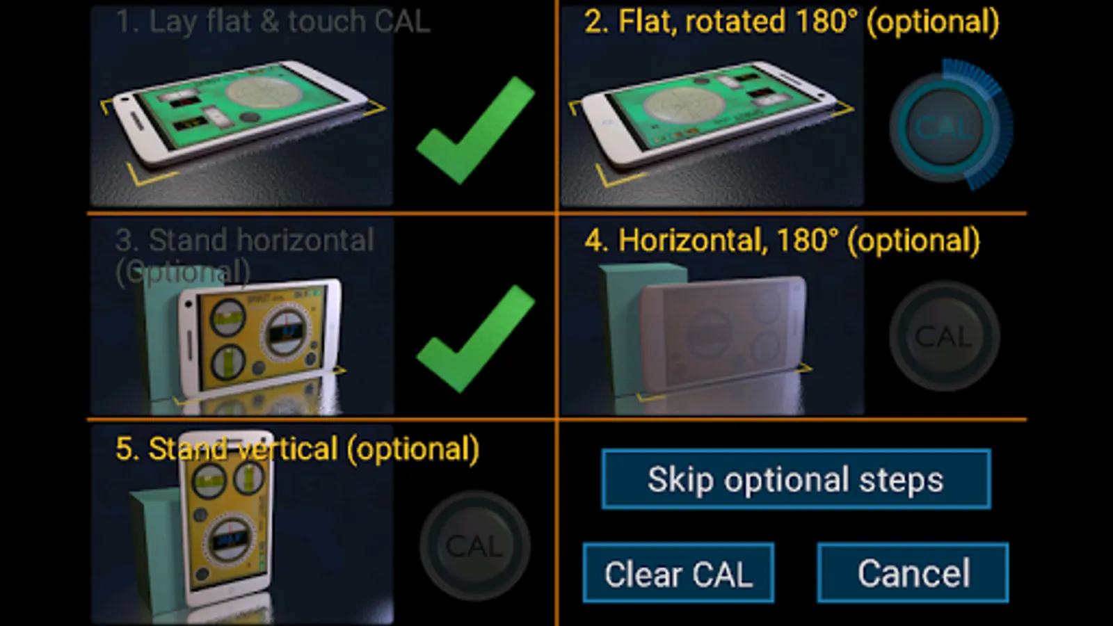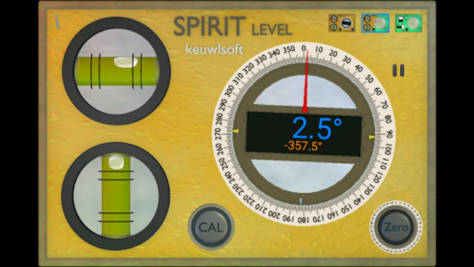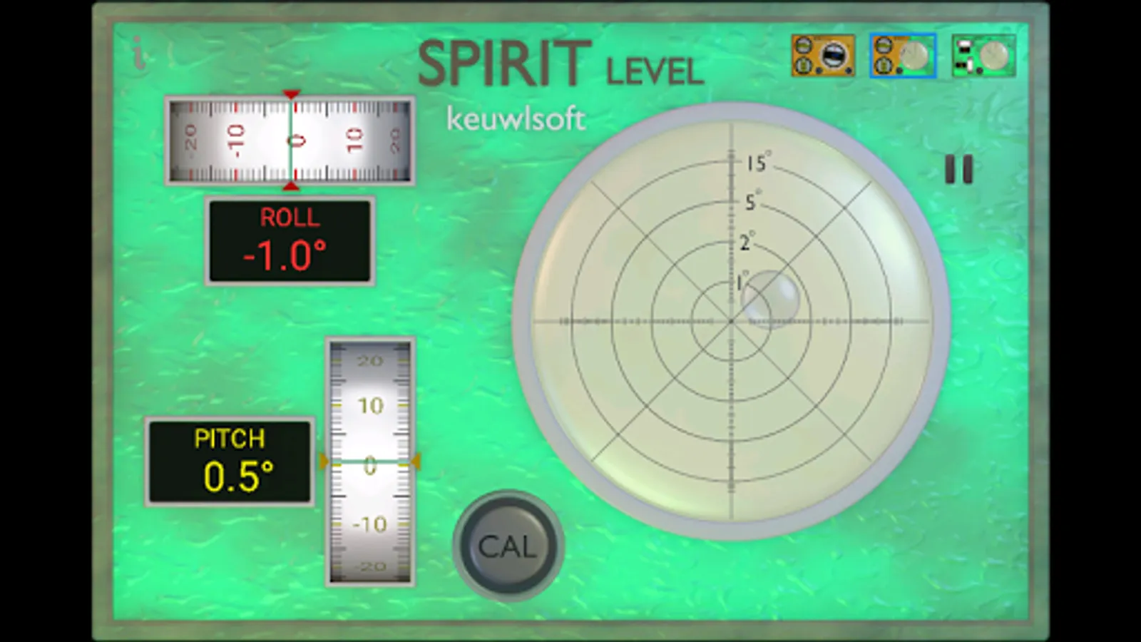 For best results touch CAL and calibrate first. The Spirit Level is only as good as your accelerometer. For indication only. Don't damage your tablet or phone, use a real spirit level when appropriate.