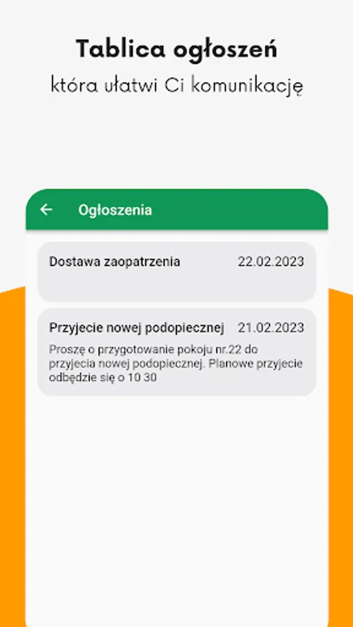 📣 Announcements: The electronic notice board in the application facilitates the flow of important information and events in the facility. Thanks to this, your staff will always be up to date!