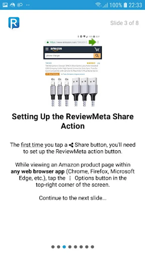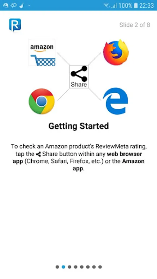 Checking an Amazon product's adjusted ReviewMeta rating is fast and easy using this app. Simply click the 'Share' icon while viewing an Amazon product within the Amazon Shopping app OR in any web browser app (i.e. Chrome, Firefox, Safari, etc.).