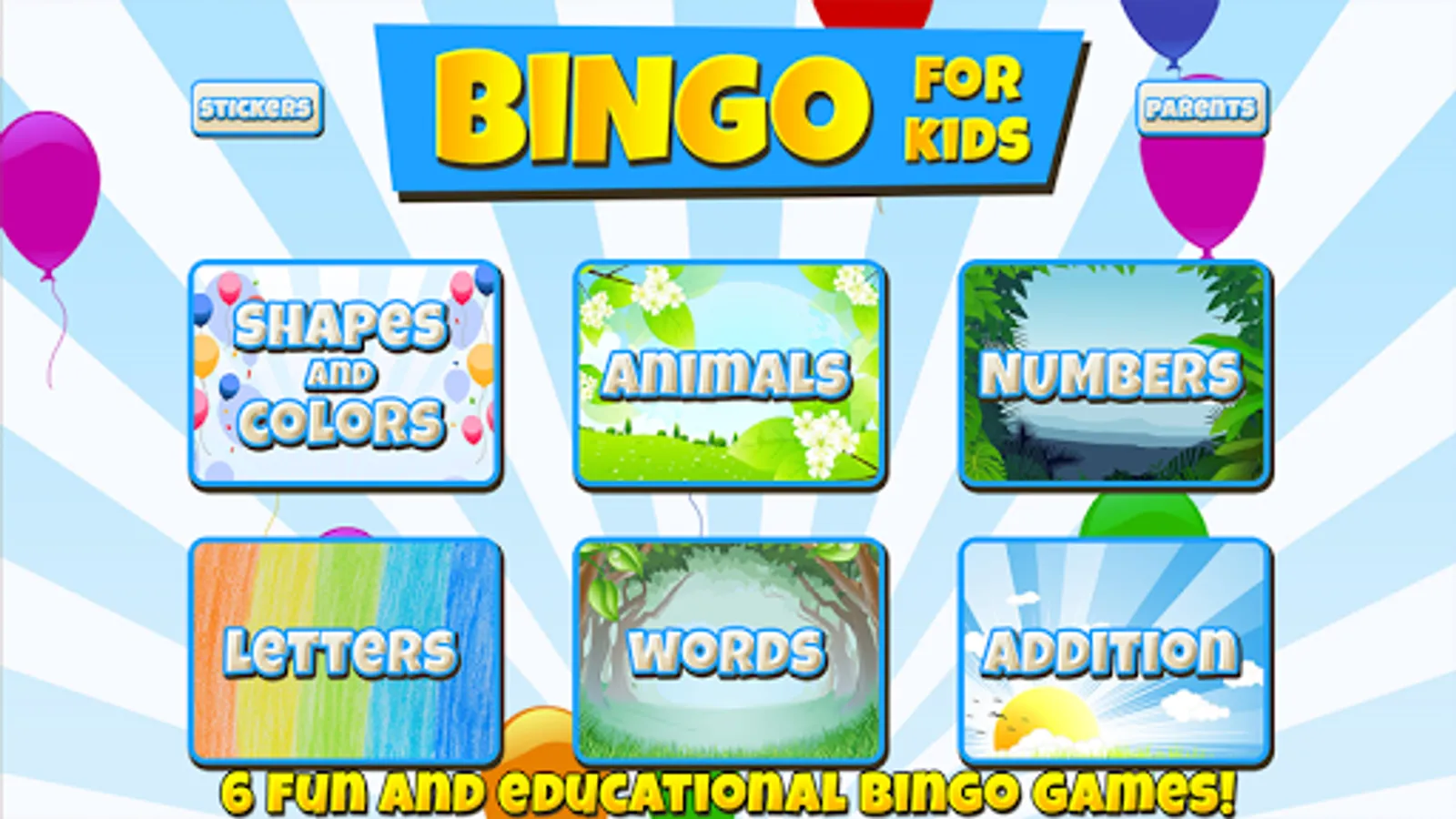 Fun and interactive bingo games for kids with educational subjects such as shapes, colors, animals, numbers, letters, words, addition, and more!