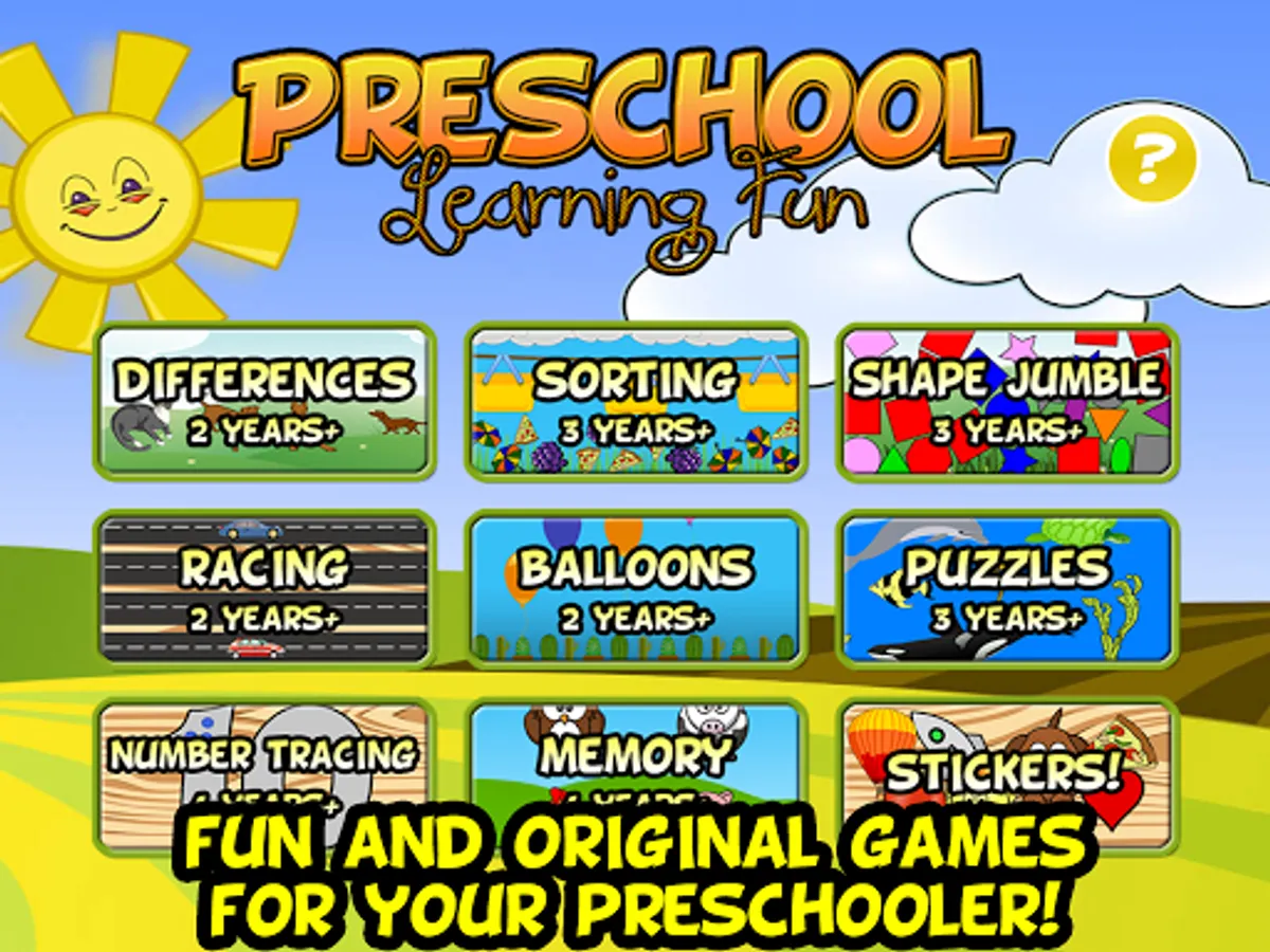 8 fun and original games to help your preschool student learn basic skills! Keep your preschool child entertained while they learn sorting, shapes, colors, differences, numbers, memory, and more! They will love playing the racing and balloons games, and you will love the fact that they're learning and entertained at the same time.