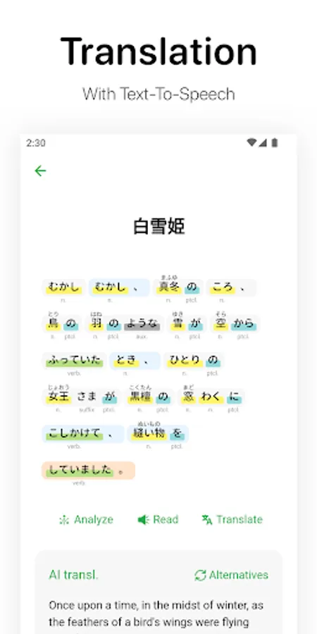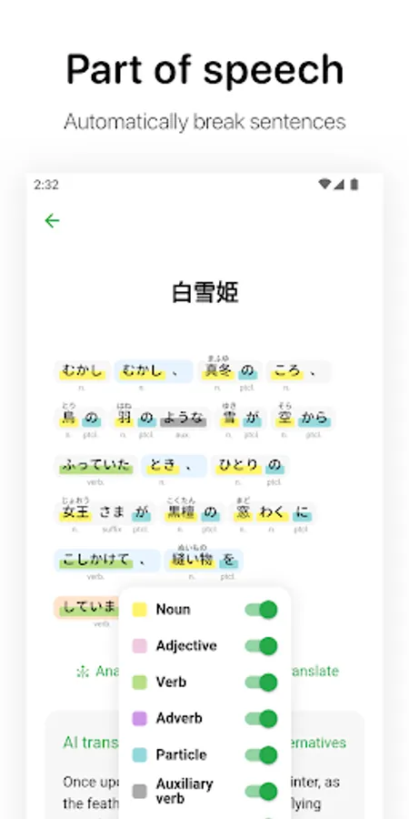 Part of speech: Use machine learning to automatically break sentences and mark the parts of speech and pronunciation of Chinese characters in sentences and paragraphs to improve your reading efficiency.