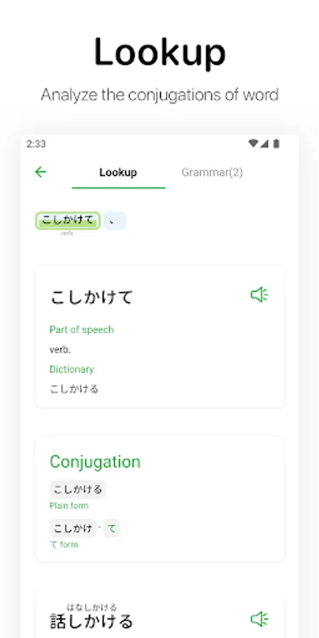 Word parsing: Oyomi can automatically analyze the conjugations of word with build-in dictionary.
