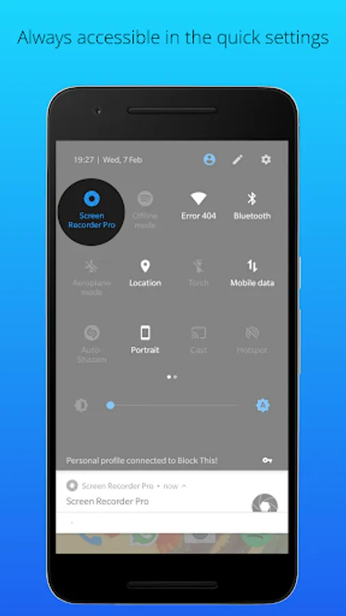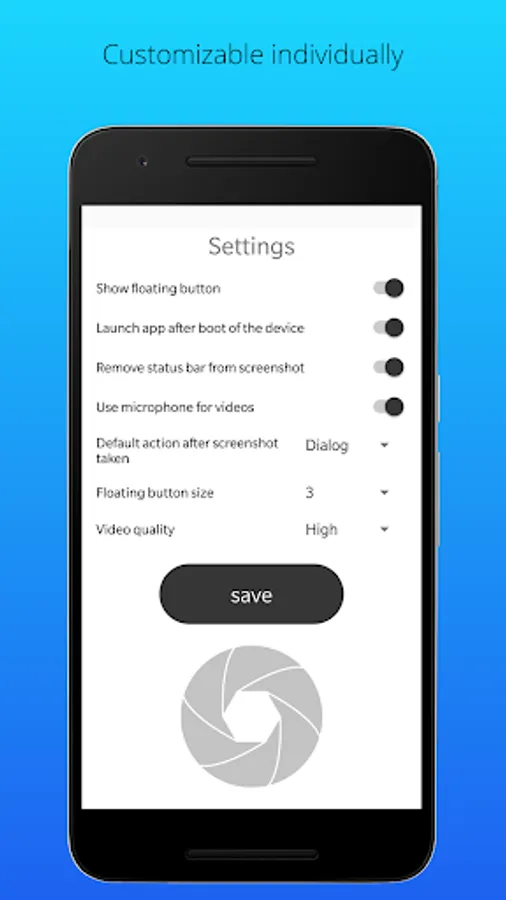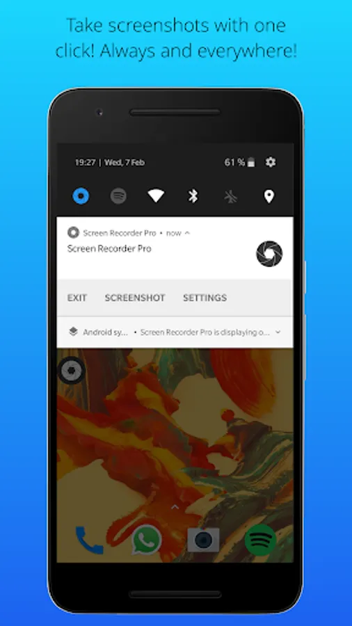 The times are over, where you had to trigger complicated key combinations just to take a screenshot or a screen video. With Screenshot Pro you can take screenshots and screen videos with just 1 click, share it with any app or crop it. Screenshot Pro is hided to the notification bar, once it is launched. That means it is always and everywhere accessible, no matter on which screens you are. You can also add a floating button to have it accessible even more quickly. By clicking on the button or the notification you can take screenshots or screen videos instantly. All screenshots and videos are stored in the gallery.
