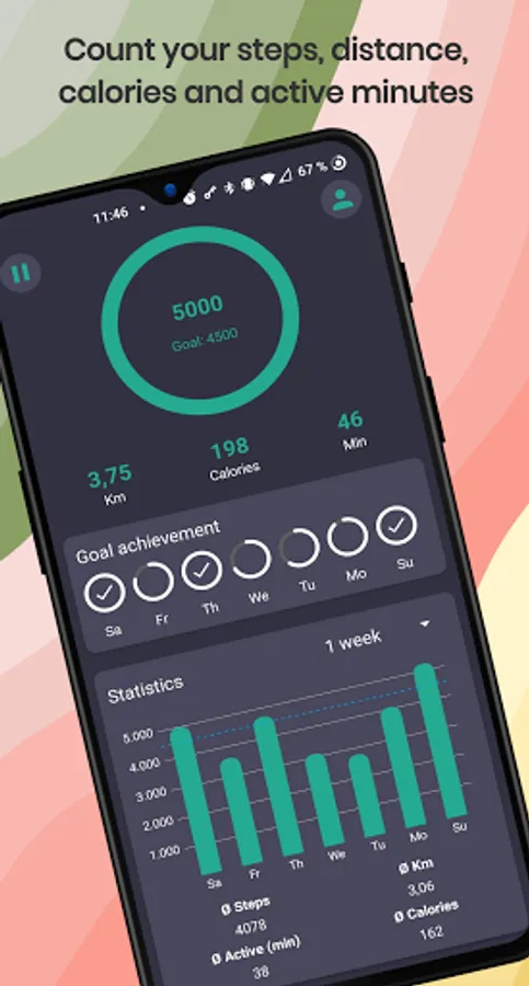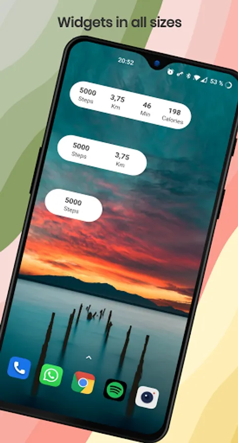 The pedometer/step counter enables energy-saving counting of your steps in the background. As soon as the pedometer/step counter is activated, it automatically calculates the number of steps, calories, activity duration and distance. All information is clearly displayed. Various pedometer/step counter widgets can be added to the homescreen to always have an overview of your activity.