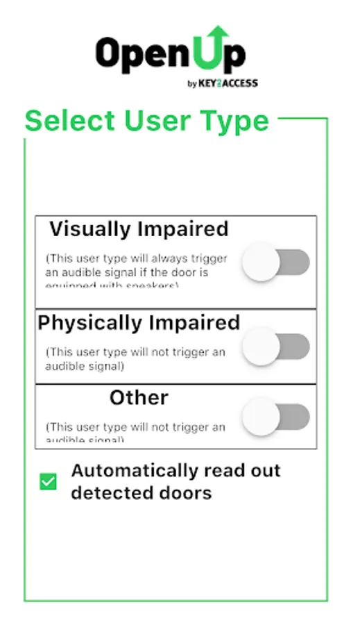 When you download the app, you have the option of selecting your user type. Please note that if you select “Visually Impaired” you may receive an added auditory cue from the door when it is opening, provided that the door is equipped with speakers.