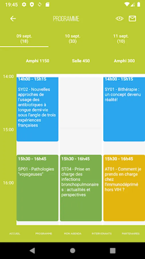 - find the program of each day hour by hour (rooms, sessions, themes, speakers, summaries, etc.) and at any time consult the current program