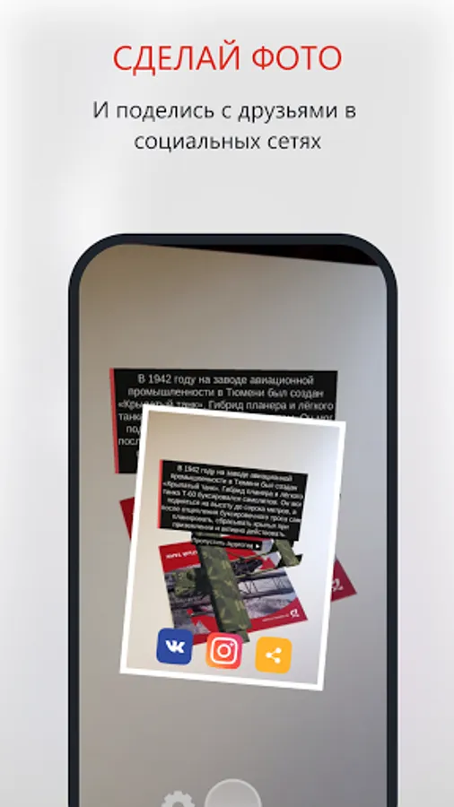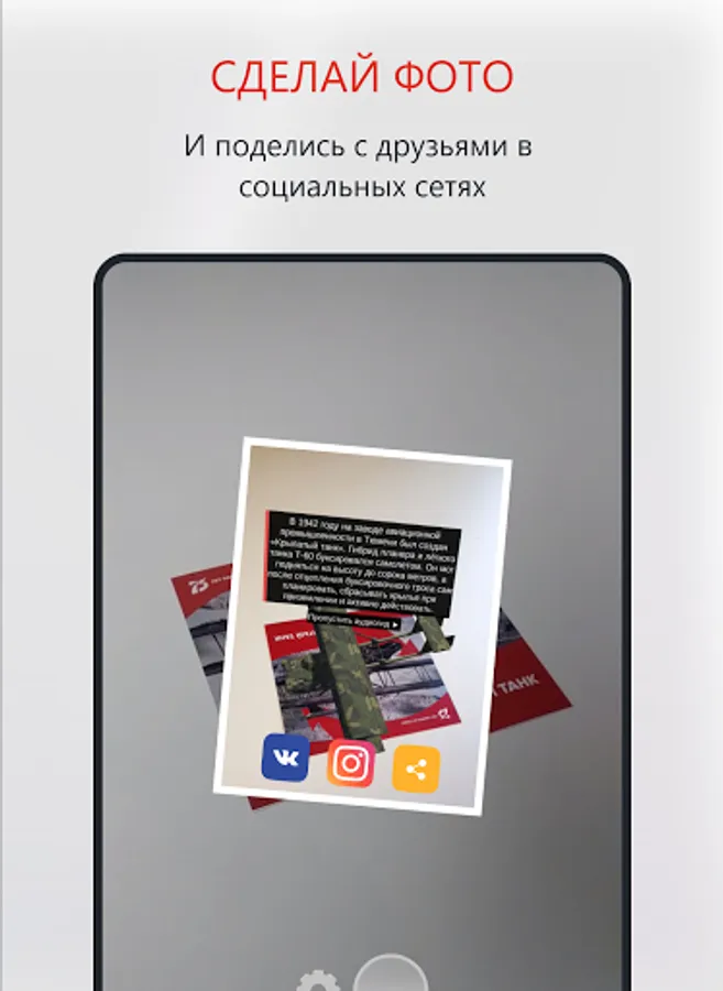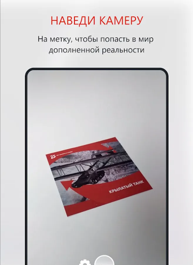 Augmented reality in our application allows you to see military equipment (a winged tank, a Katyusha combat vehicle, a bath train, a torpedo boat)