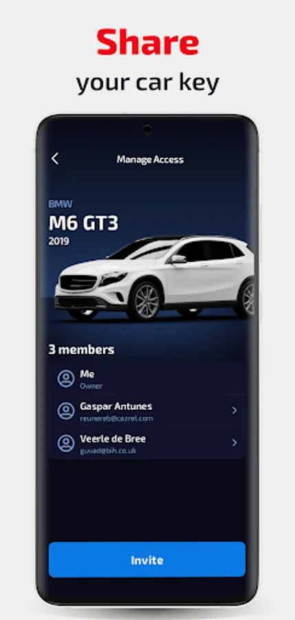 > Share car key securely with BANK-GRADE SECURITY protocol. Share car key digitally with car renters without physical keyfob exchange or with other family members in need.