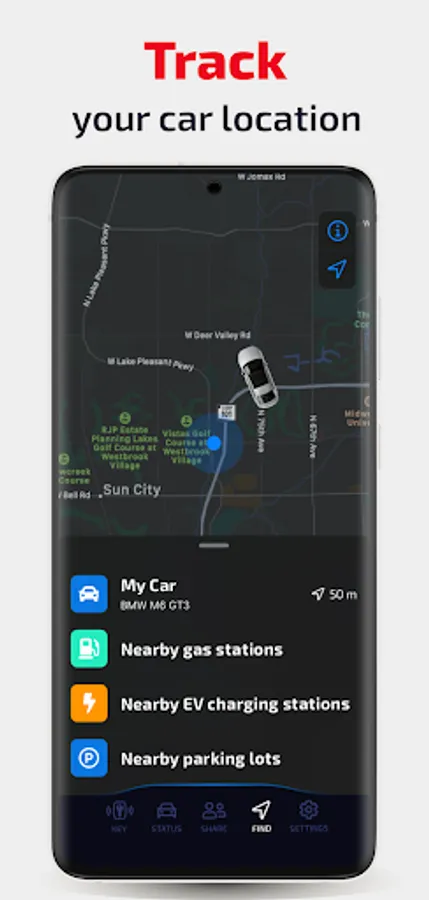 > SMART NAVIGATION to remotely locate your car or find fastest routes to car parks or gas / EV charging stations on maps.