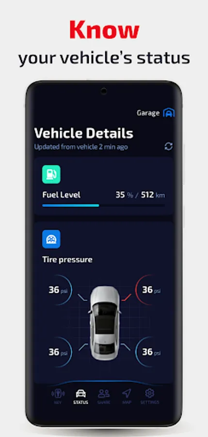 > Ensure drive safety before departure. Remote CHECK LIVE vehicle engine status including tire pressure, oil / EV battery level, and receive safety alerts to avoid risks of road accidents or engine breakdown when driving.
