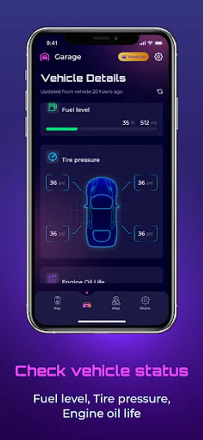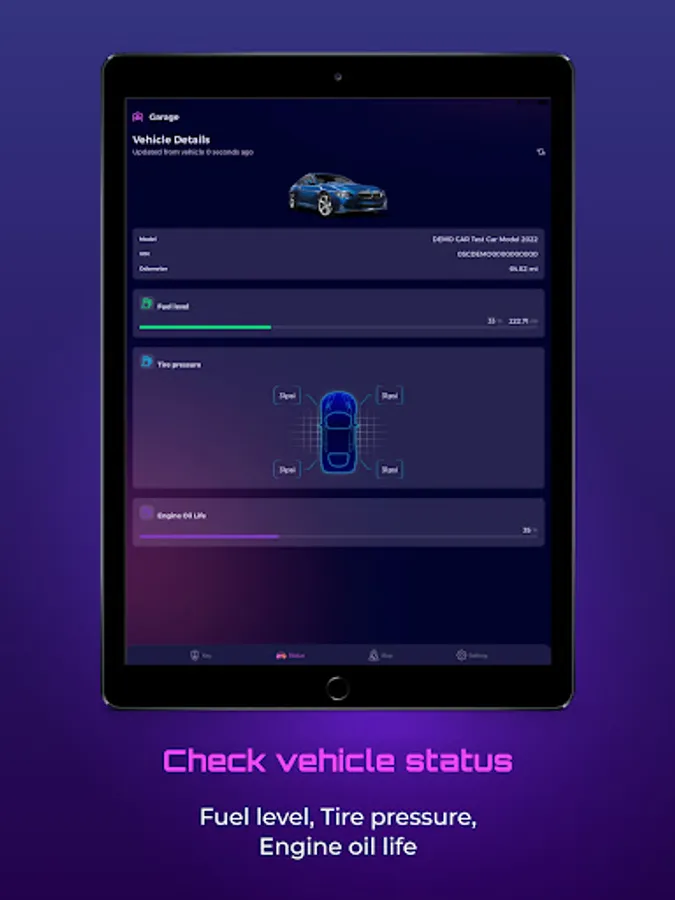 + Ensure drive safety before departure. Remote CHECK LIVE vehicle engine status including tire pressure, oil / EV battery level, and receive safety alerts to avoid risks of road accidents or engine breakdown when driving.