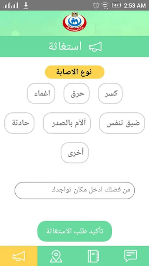 1- SOS, through the SOS button, you can send a SOS to the operating room of the Medical Mission of the Egyptian Ministry of Health with your current location and the health situation you are going through (or going through another pilgrim in front of you) which enables the operating room to contact you and provide the required assistance