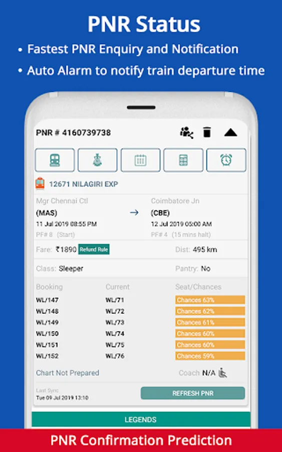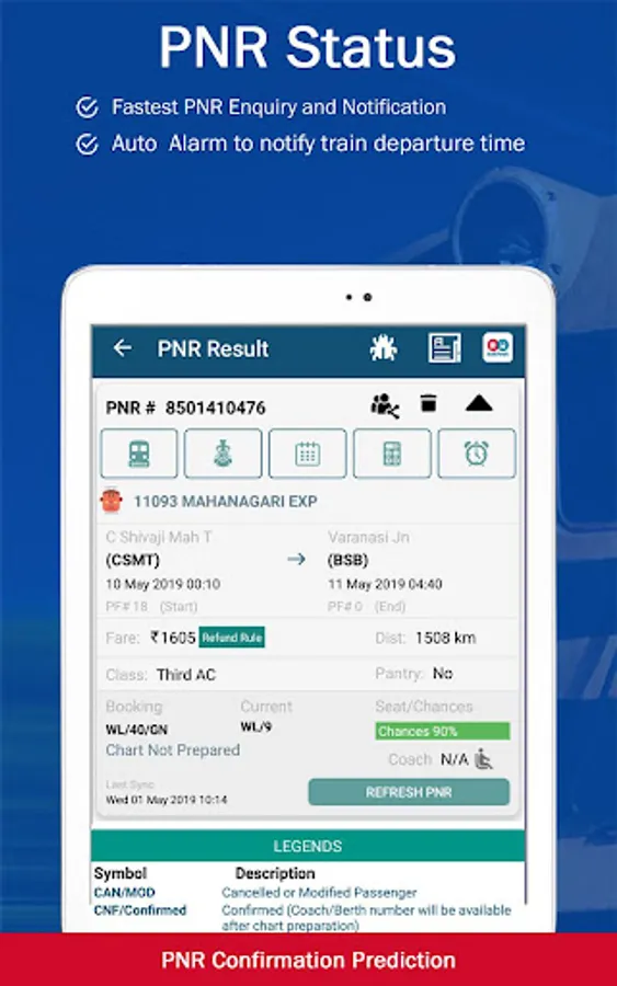 We not only provide PNR status check for railway ticket, train seat availability, train running live status, NTES Rail Enquiry System but also information on Fares, Platforms, Coaches, Meal Charges, Offline Train Routes, Cancelled Trains, Seat Map, Alarm and much more.
