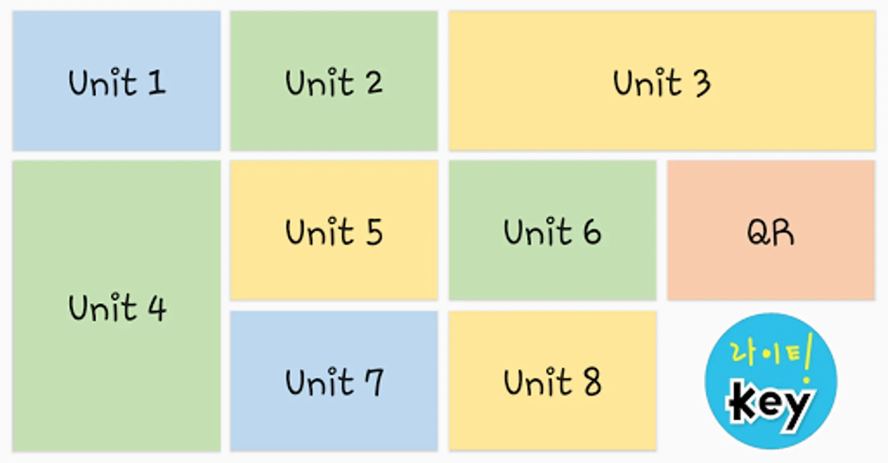 Unit 1, 3, 5, 7에서는 각 Unit의 키워드와 Sentence를 설명하는 영상자료가 기획되었습니다.