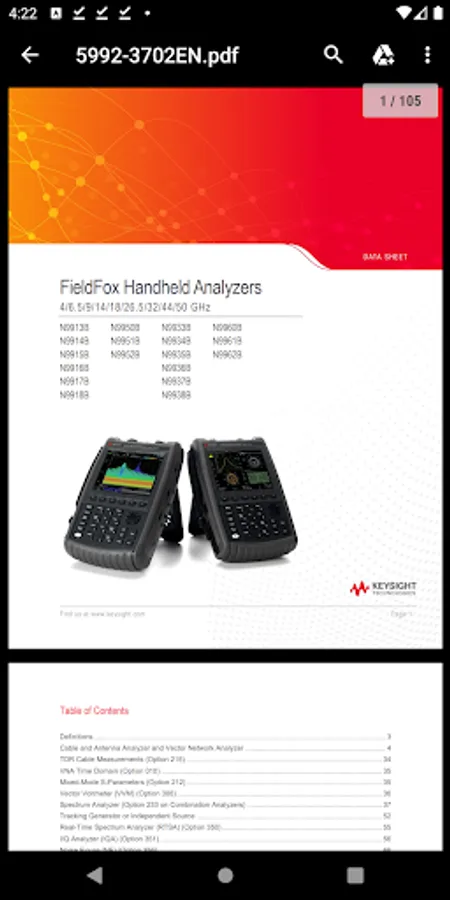 The FieldFox app also contains documentation and manuals that compliment your instrument, including Literature, Manuals, informational video links and more.