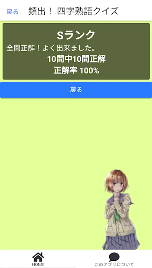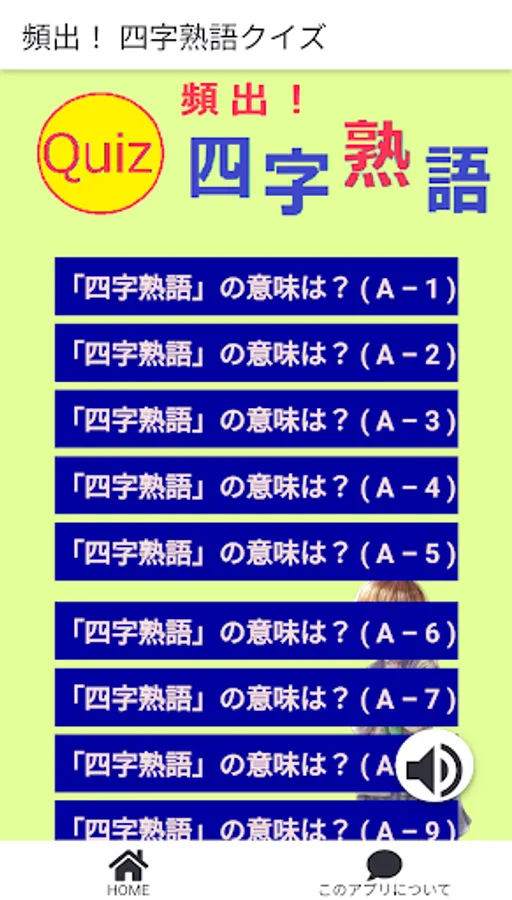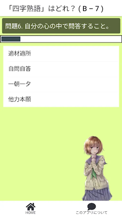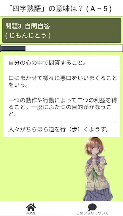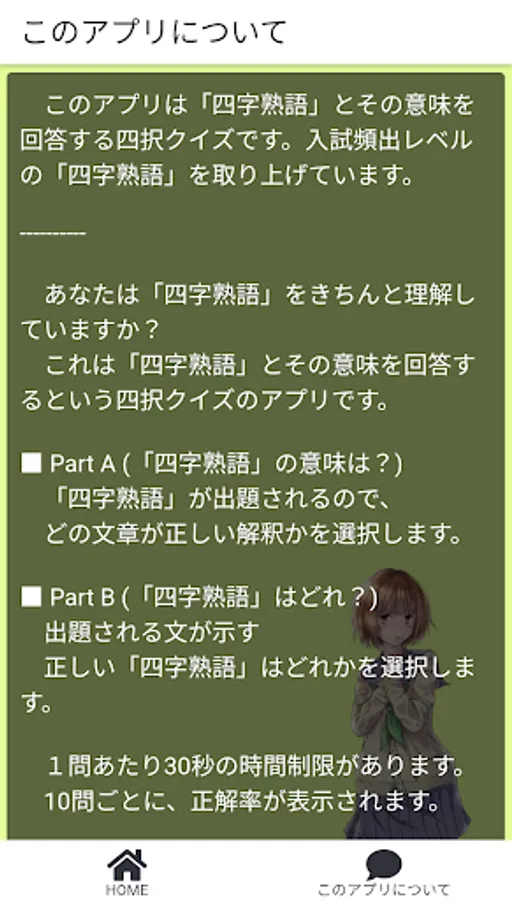 This is a four-choice quiz app that answers "Yojijukugo" and its meaning.