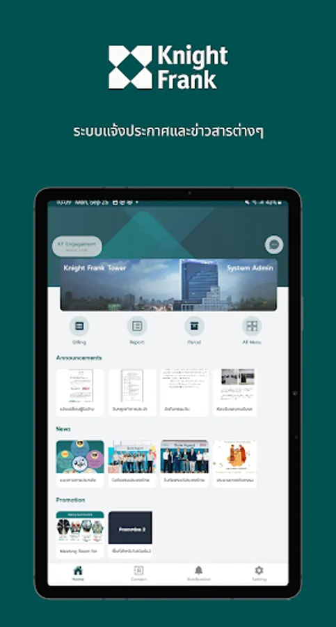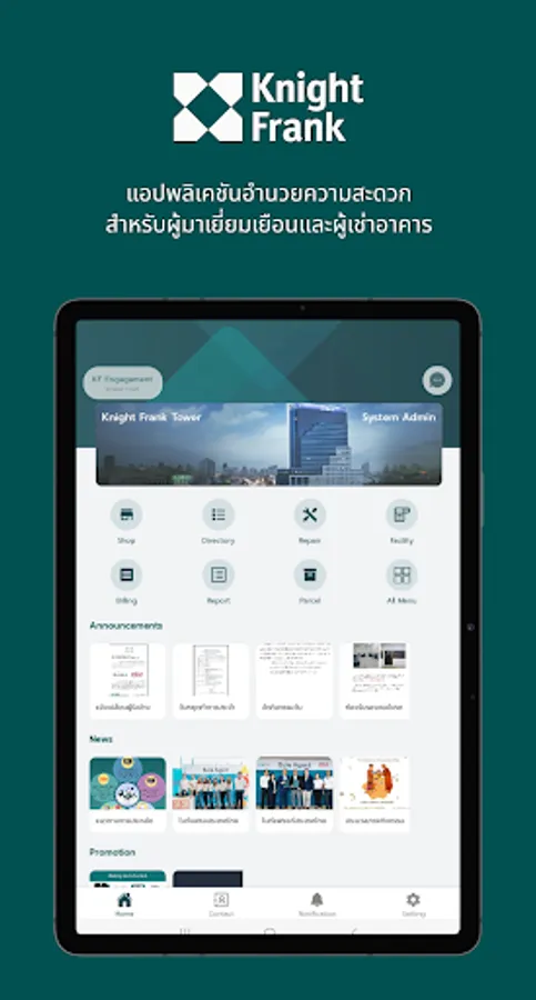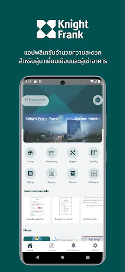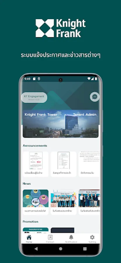 KF Engagement เป็นแอพพลิเคชั่น ที่บริษัท ไนท์แฟรงค์ ชาร์เตอร์ (ประเทศไทย) จำกัด ได้พัฒนาขึ้นเพื่อเป็นช่องทางในการติดต่อสื่อสารและมอบบริการในหลากหลายด้านของอาคารสำนักงานให้แก่ผู้เช่าและผู้เยี่ยมเยือน