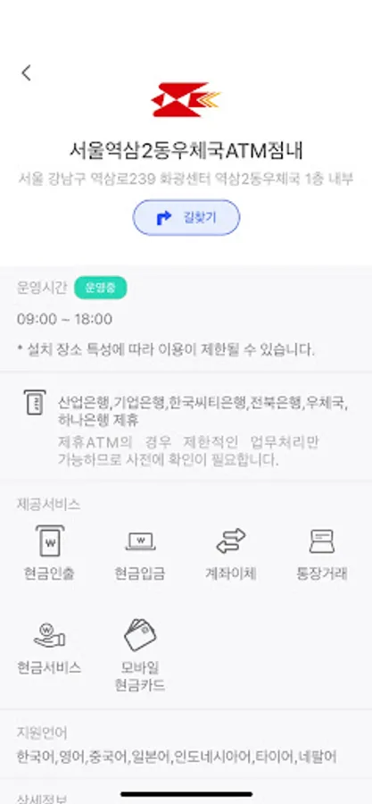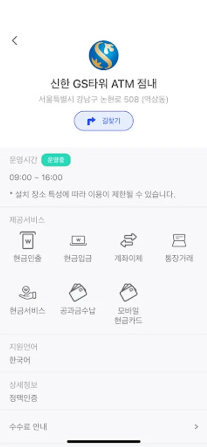 - It provides phone calls and directions, and operating hours, affiliated banks, wheelchair availability, etc. are also inquired.