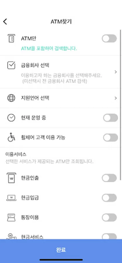 -On the main screen, you can search only ATMs without branches, and you can search according to settings such as specific financial companies, operating status, wheelchair availability, and service use.