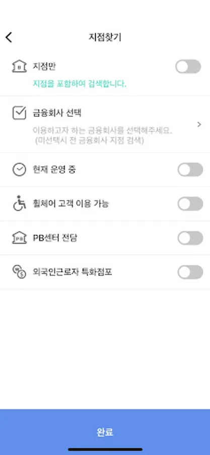 -On the main screen, you can search only branches without an ATM, and you can search according to settings such as specific financial companies, operating status, wheelchair availability, etc.