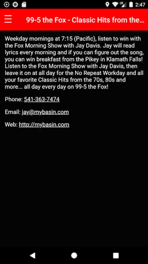 The Classic Hits that you love to sing along with. From the 70's, 80's and more. We are the Klamath Basin's new favorite radio station, with Jay Davis and the Fox Morning Show and the No-Repeat Workday. Broadcasting from downtown Klamath Falls, we are the perfect at work radio station too.