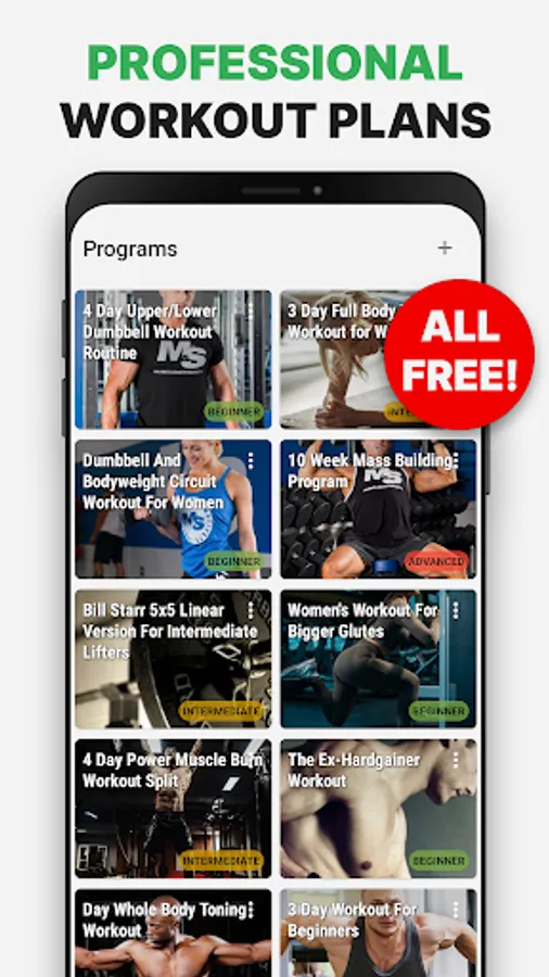 • Built-in programs include stronglifts 5x5, upper/lower body splits, home dumbbell workouts, body toning and fullbody routines, abs and glutes workouts for women