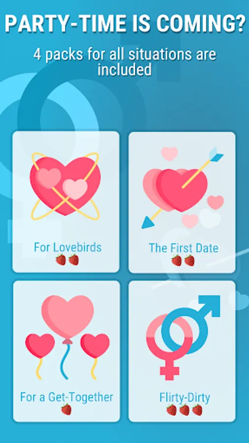 50 cards with tasks and questions available in the game for free. There is also an option to purchase more than 500 cards of truth or action (buy cards for a specific set) or arrange a monthly/weekly subscription.