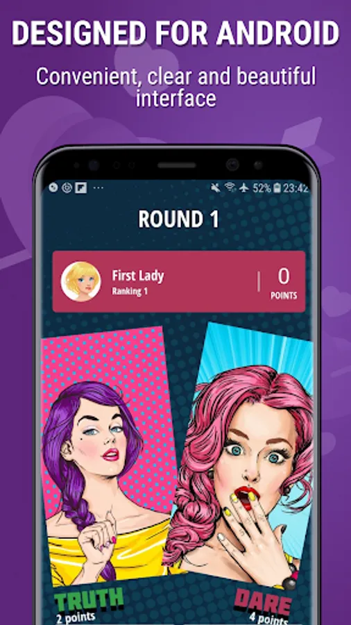 + In True or action 18+ there is a scoring system. For each completed action or response, players receive points. The results are calculated by the smartphone automatically. Unfortunately, the program can not recognize if you told the truth or a lie, so all the answers will be counted as true)