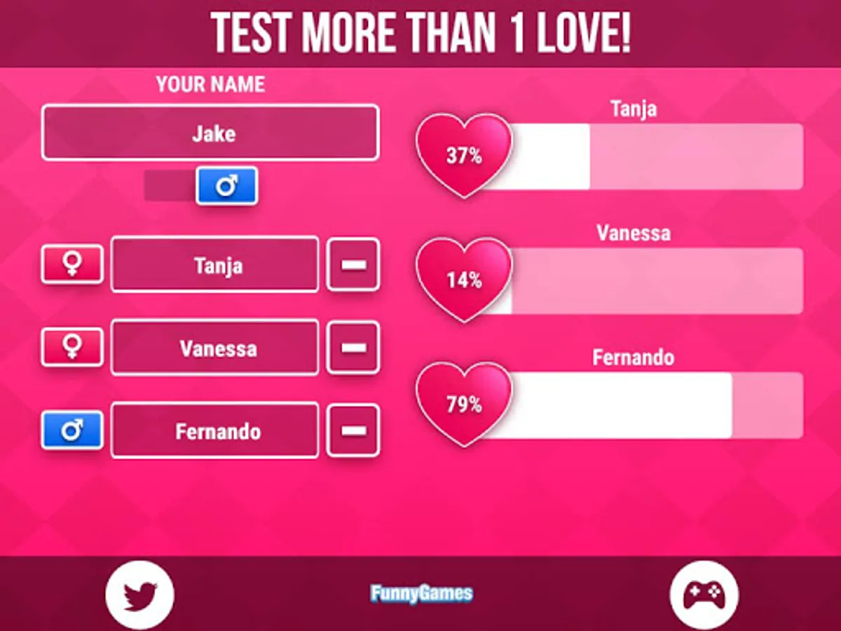 Test your love with the Love Tester love meter app! The Love Tester is a love detector which let you test love for free. Find your true love with this fun and unique Love calculator. Want to test your love? Just write your name and the name of your lover and press test! The love tester will return with a love percentage. Happy with the result? Share your result on Facebook or Twitter!