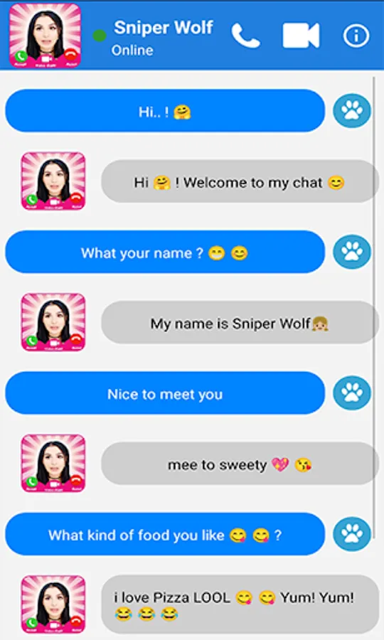 Prank your friends and joke with them by Sniperwolf Fake call.Connect to SniperWolf fake Call by clicking on the fake chat button and have fun with your friends.