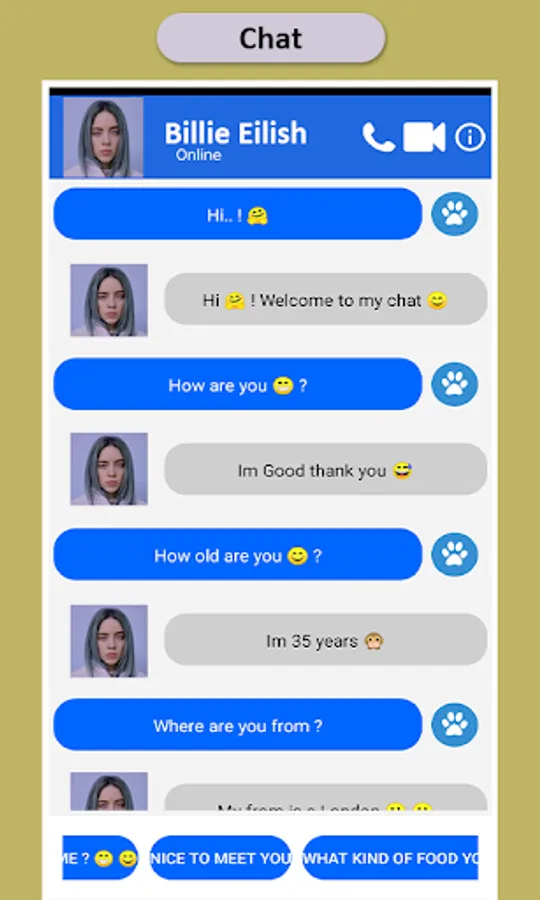 A mobile app to perform fake chat and video call with Billie Eilish. We added a lot of fake messages for users able to make a fake chat and fake video call with Billie Eilish. Download it now!