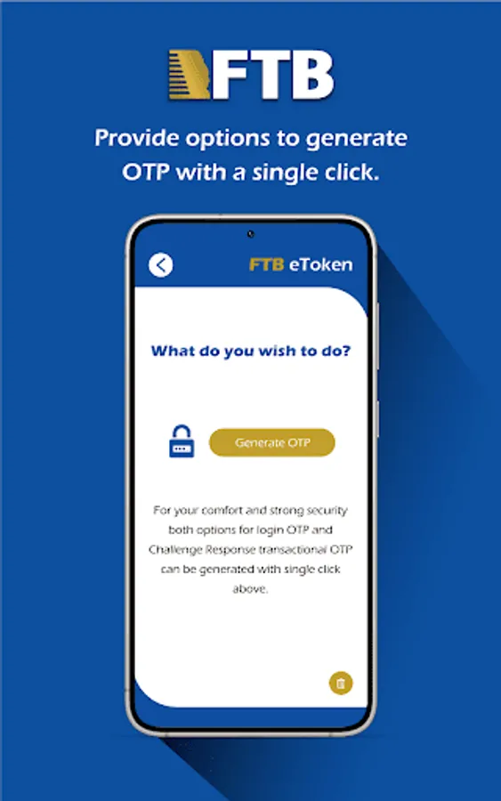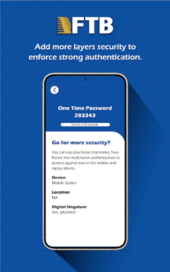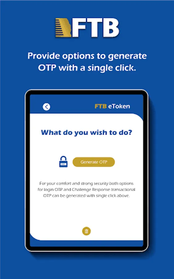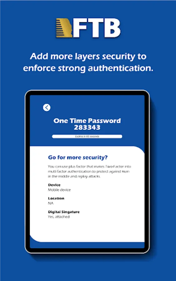 FTB eToken App is comprehensive identity password management and strong multi-factor-authentication platform that provides a centralized set of services across multiple service channels and business units.