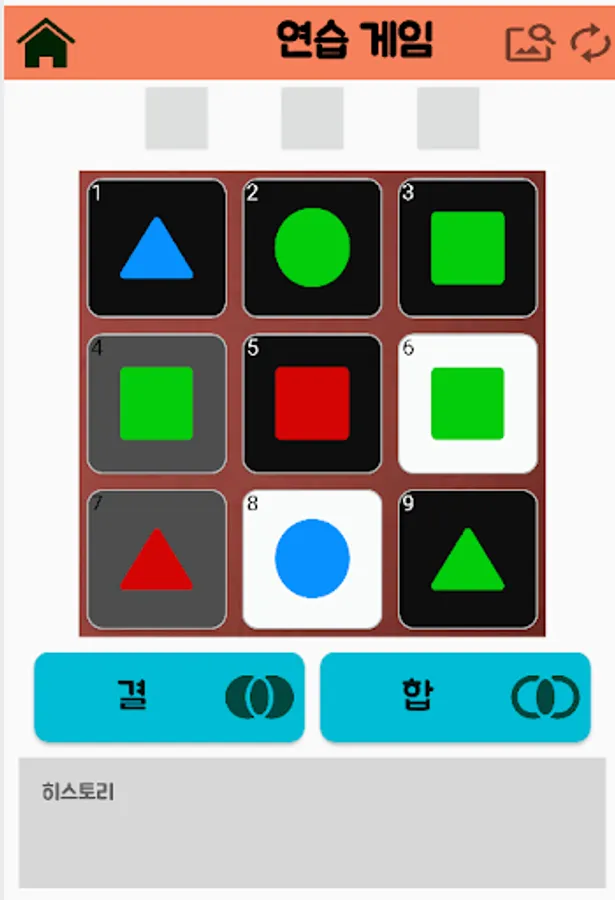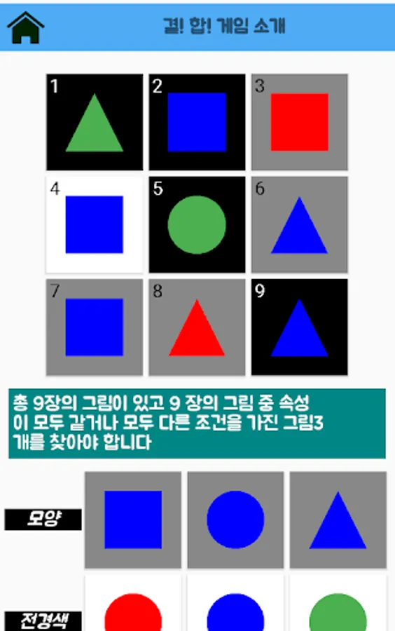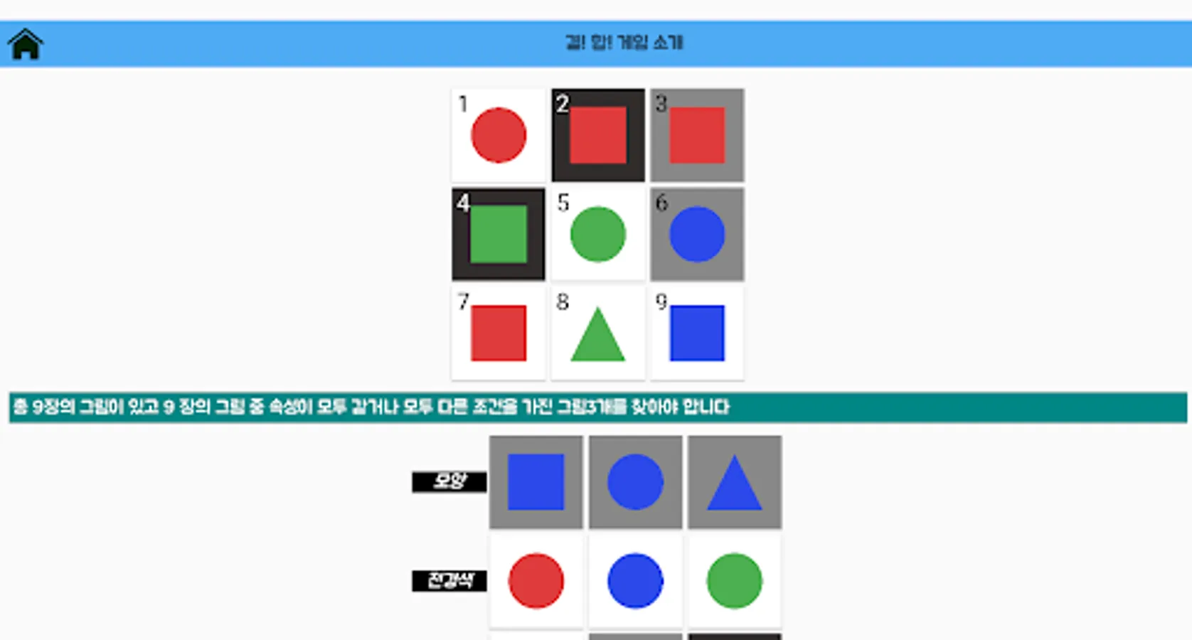 A total of 9 shape pictures appear, and out of 9 pictures, all 3 pictures with the same properties or all different conditions are found.