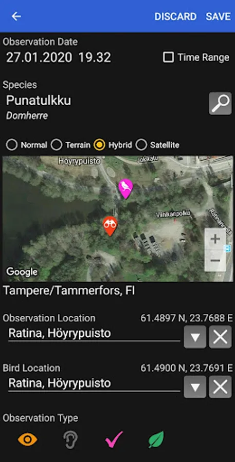 - Havainnon ajankohdan voi kirjata aikaväliksi, tai jättää kellonaika ilmoittamatta (pitkä kellonajan painallus poistaa sen).