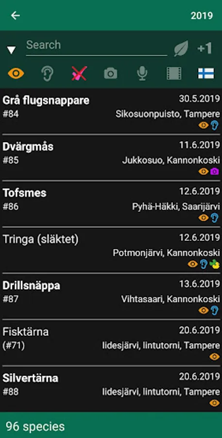 - Havaintoselain, jota voi suodattaa lajinimellä tai havaintomääreillä. Havaintolistasta voi tarkastella havaintoa tarkemmin tai muokata sitä.