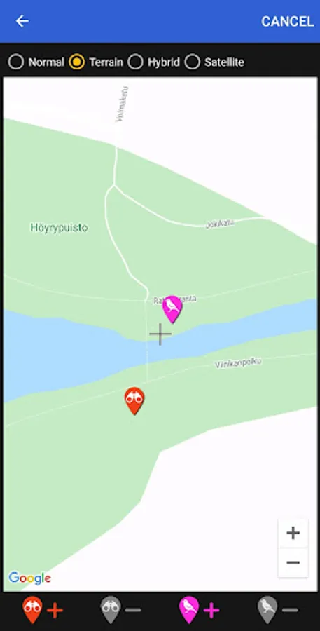- Havaintojen kirjaus jälkikäteen. Kuten kirjaus paikanpäällä, mutta paikka asetetaan käsin kartasta.