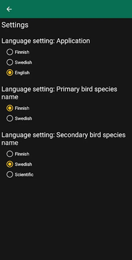 - Suomenkieliset, ruotsinkieliset ja tieteelliset lajinimet, risteymät ja epätarkat määritykset kuten "harmaahanhilaji" tai "urpiainen/tundraurpiainen". Englanninkieliset lajit tulossa. Sovelluksen kielet ovat suomi, ruotsi, englanti.