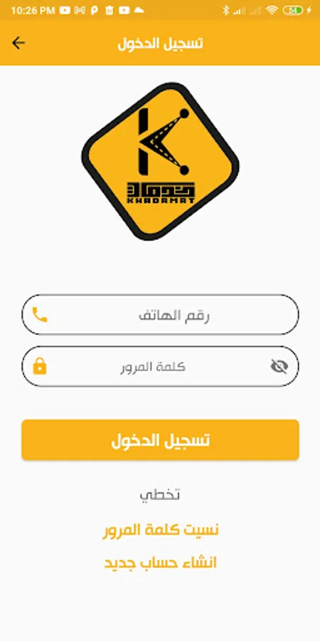 عند فتح التطبيق يقوم بالانتقال بك لصفحة تسجيل الدخول لتقوم بتسجيل الدخول ان كنت تمتلك حساب وان كنت لا