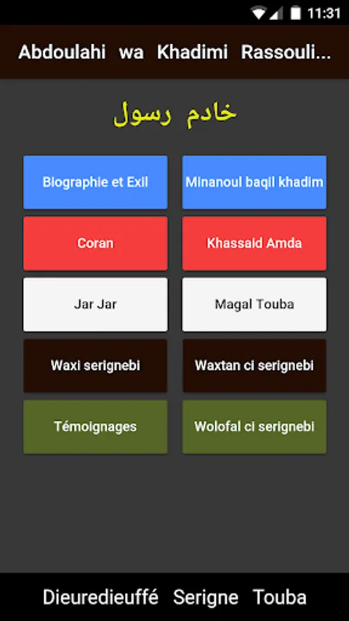 This app summarizes the biography and route of Serigne Touba Sheikh Ahmadou Bamba Khadimou Rassoul in French language and Wolof.