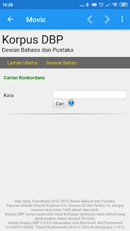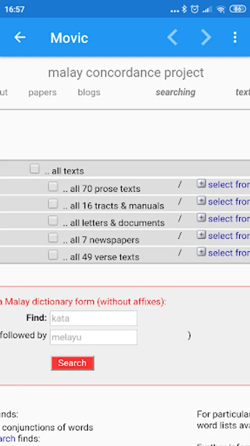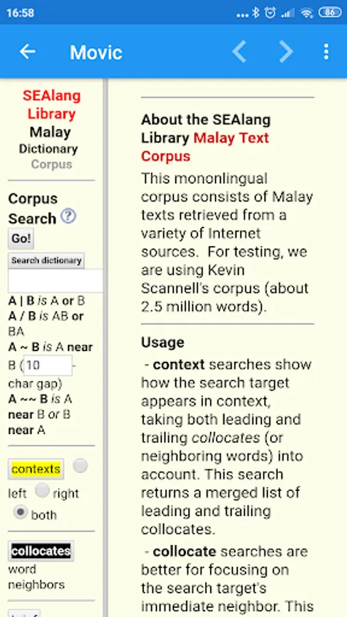 We integrate access to all Malay corpus available to make life of Malay Text Researchers a little bit easier. This integration consist of Dewan Bahasa dan Pustaka, Pusat Rujukan Persuratan Melayu, Mybaca, Lexilogos, Malay Concordance Project, and SEAlang project.