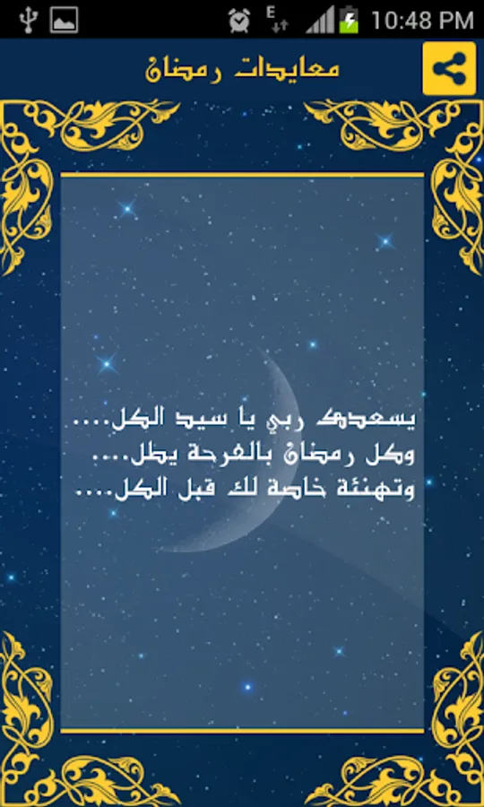 وسوف تسمتع من خلال تحميلك للتطبيق بأجمل رسائل ومعايدات رمضان وكذلك معايدات عيد الفطر مع امكاينة مشاركة المعيدات والأذكار والنصائح مع الأصدقاء والأحبة.