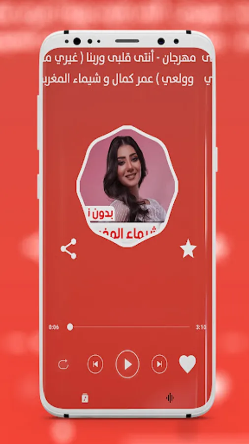 The application contains all the songs of Shaima Al Maghribi without Net 2023, carefully selected. These are new Egyptian songs without the net, romantic songs, songs of love and feeling that suit all tastes. The application contains the album of Shaima Al-Maghribi 2023, where the most beautiful songs were chosen in the application to suit your taste, and you will also find many beautiful features in the application. The songs were carefully selected so that the application contained the new songs of Shaima Al Maghribi without the net.