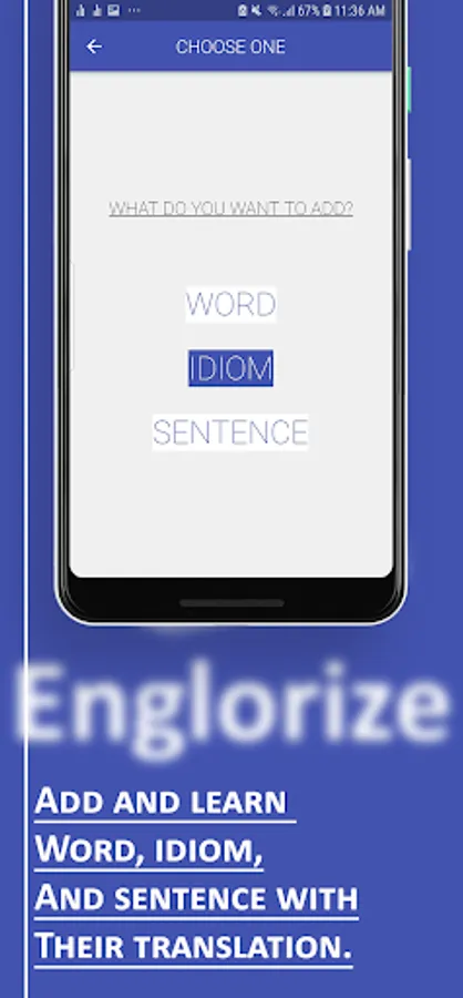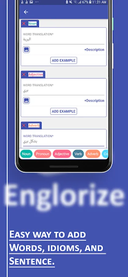 Englorize is an app like any another flashcards apps such as Quizlet, AnkiDroid, and Cram.com but it's specialized in English language studying which gives many way to help you learn and practice English language.