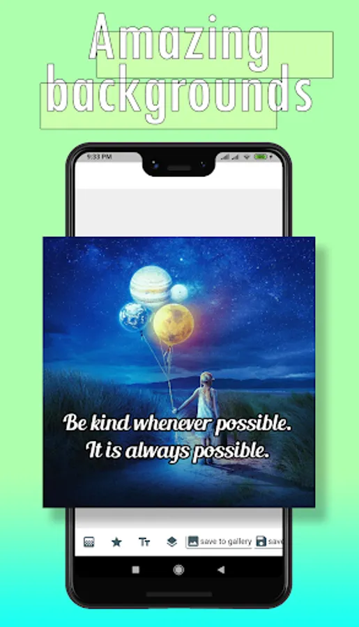Quotes Creator is the best and easiest way to create and share your quotes with the world. Quotes Creator ready with customizing options such as background, text colors, text size, and fonts, or you can choose your photo from your Photo Gallery to be used as background, so you can share your own quotes with your friends.